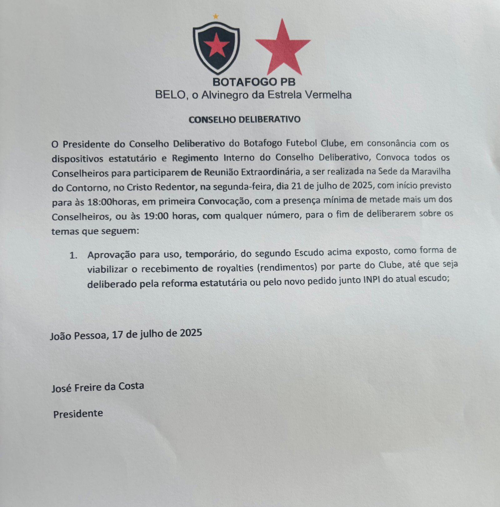 O presidente do Conselho Deliberativo do Botafogo Futebol Clube, José Freire da Costa (Zezinho Botafogo), convocou os conselheiros para uma reunião extraordinária a ser realizada na próxima segunda-feira, dia 21 de julho de 2025, na Sede da Maravilha do Contorno, em João Pessoa. O ponto da pauta é a aprovação para uso temporário de um segundo escudo do clube.